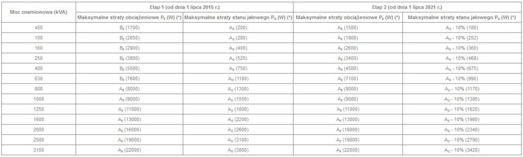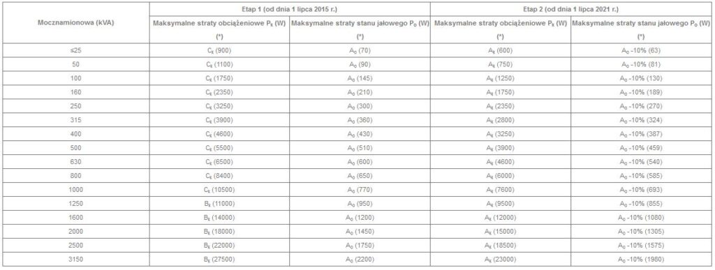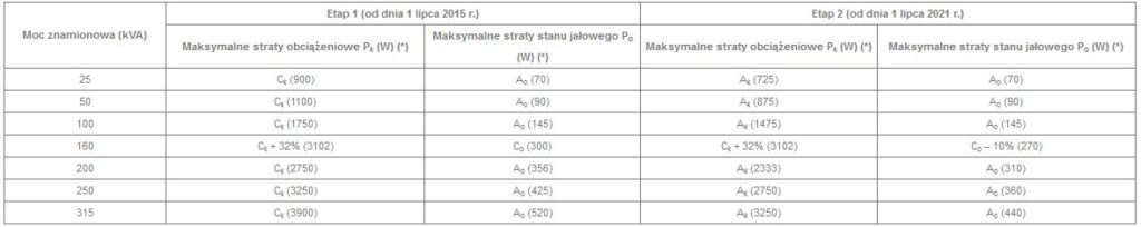 Transformatory zakupione po wejściu w życie dyrektywy muszą spełniać maksymalne dopuszczalne wartości strat jałowych i obciążeniowych lub wskaźnika maksymalnej sprawności (PEI). Osobne wymagania dotyczą nasłupowych transformatorów elektroenergetycznych średniej mocy. Muszą one spełniać maksymalne dopuszczalne wartości dotyczące strat.